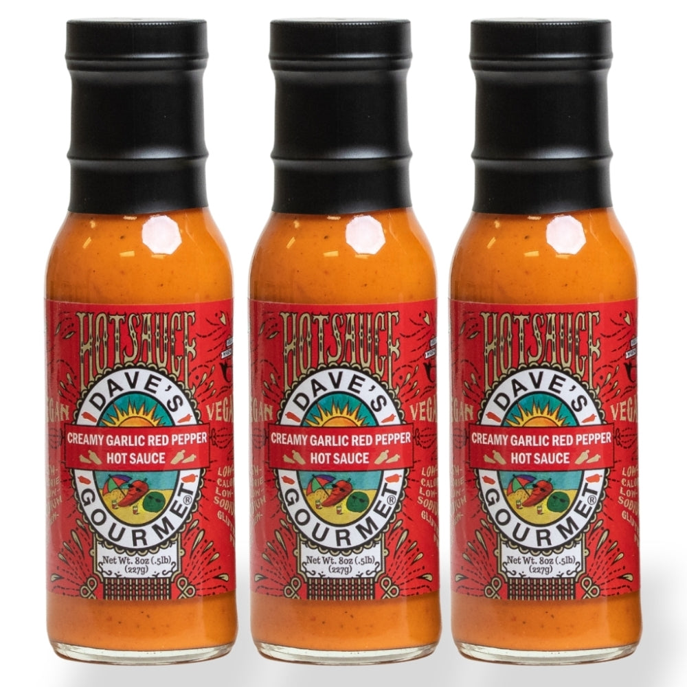- Three (3) 8oz bottles of Dave’s Gourmet Creamy Garlic Red Pepper Hot Sauce