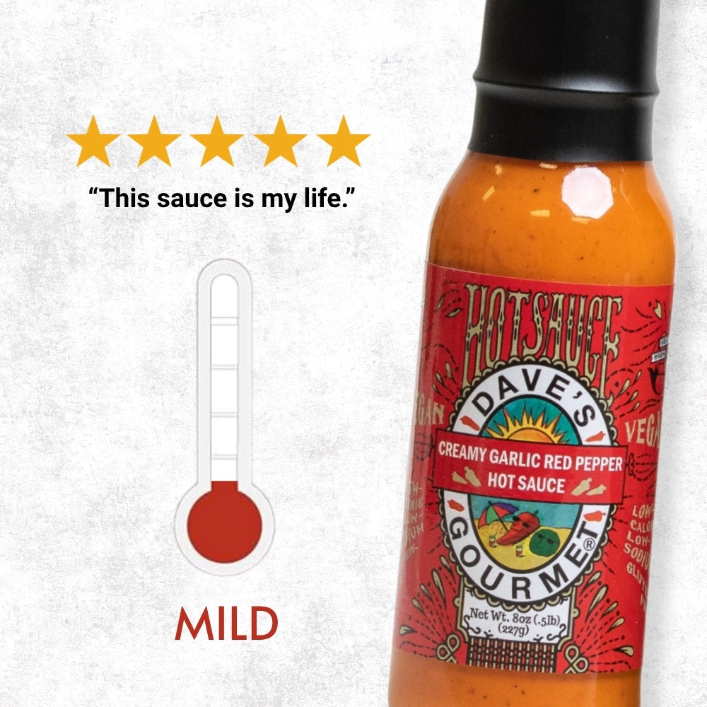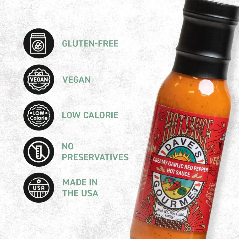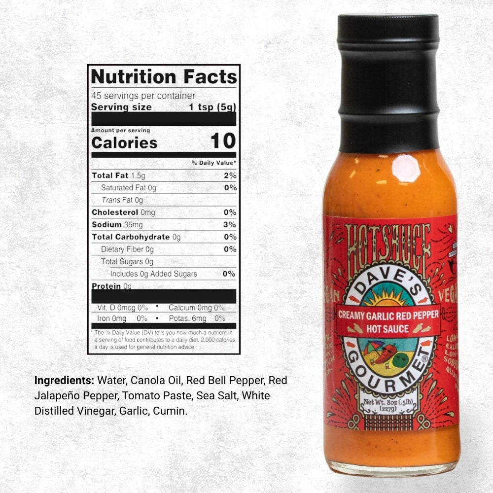 Dave's Gourmet Creamy Garlic Red Pepper Sauce is a blend of spicy red chilies, sweet roasted peppers, garlic, and spices. Try a spoonful and savor the creamy sweetness of roasted red peppers followed by the zip of red chilies. This sauce is moderately spicy so you don’t have to be a hot sauce lover to enjoy it.